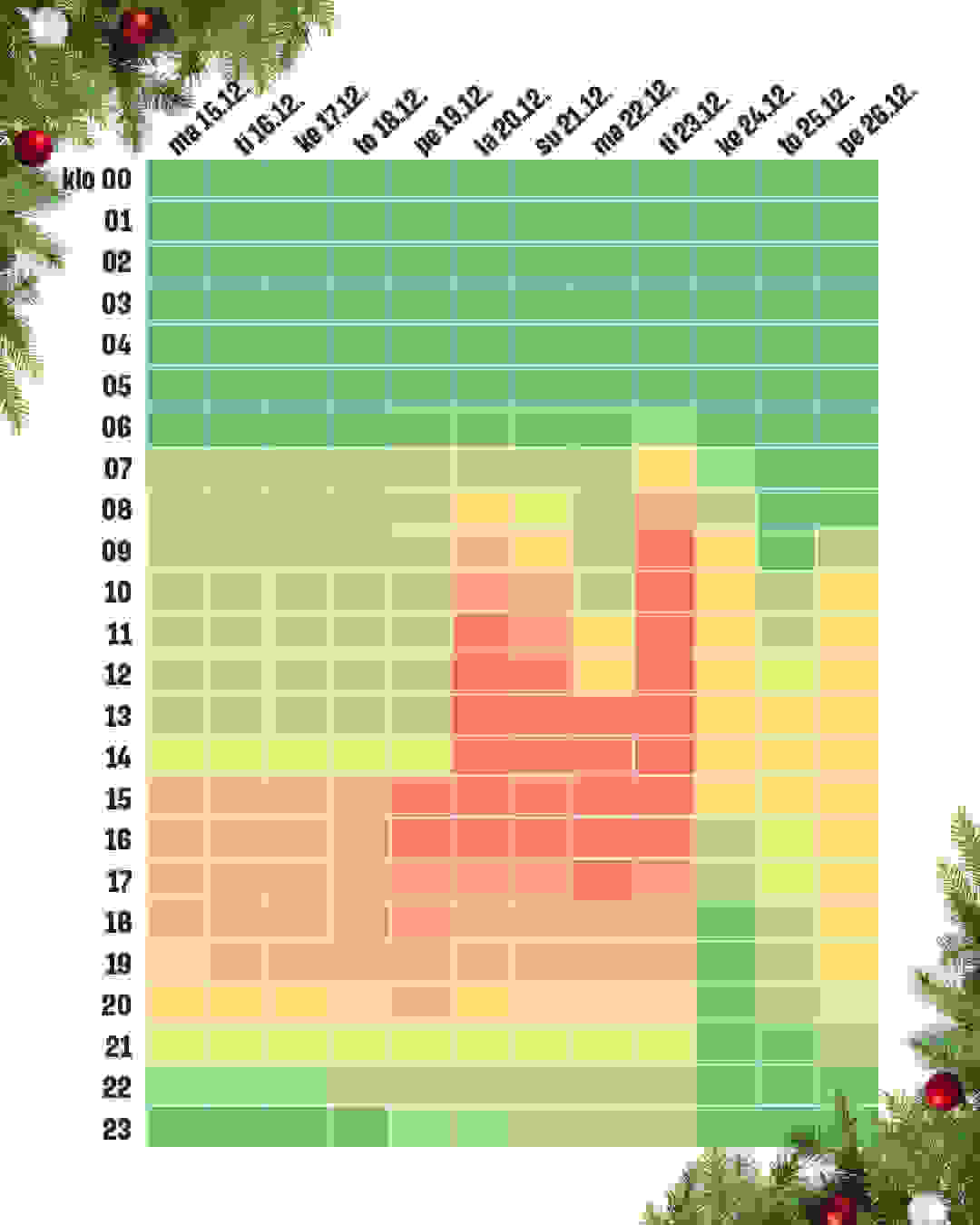 Ennuste joulunalusviikkojen väljimmistä ja toisaalta eniten vilskettä sisältävistä hetkistä Prismassa. Ennuste perustuu viime vuoteen huomioiden pyhien sijoittumisen eri viikonpäiville kuin viime vuonna. Prismoissa ympäri Suomen tuhannet työntekijät varmistavat sujuvaa asiointia kaikille päiville.